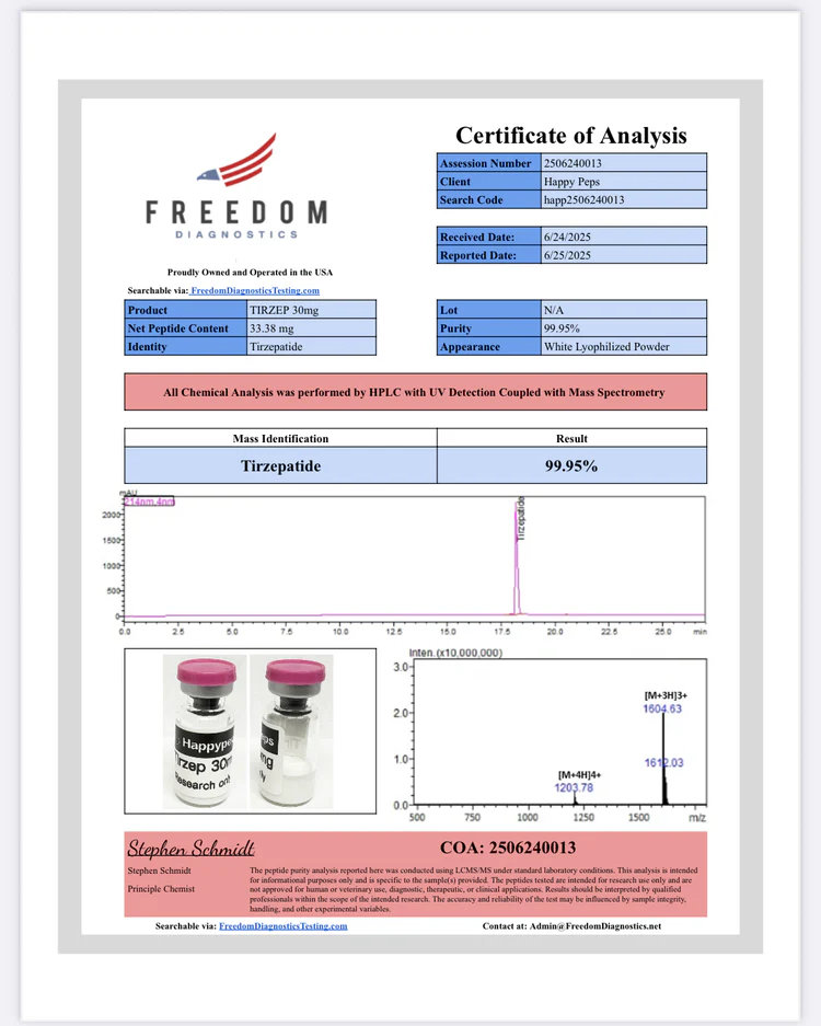 Happypeps se compromete a analizar todos los nuevos lotes de péptidos en laboratorios acreditados de terceros, que ofrecen verificación tanto de pureza como de dosis del producto.